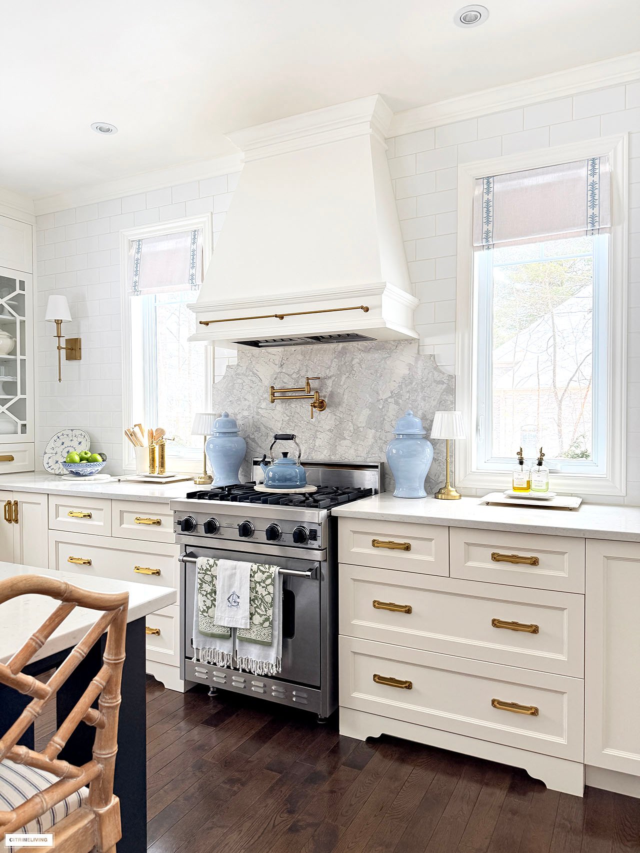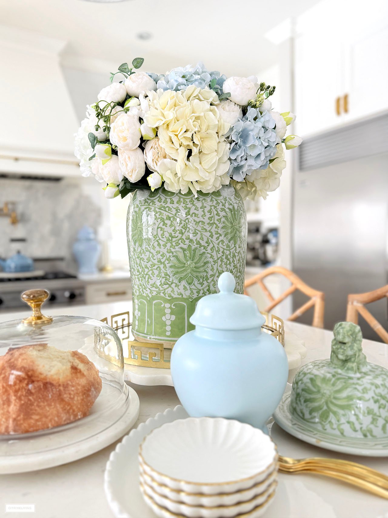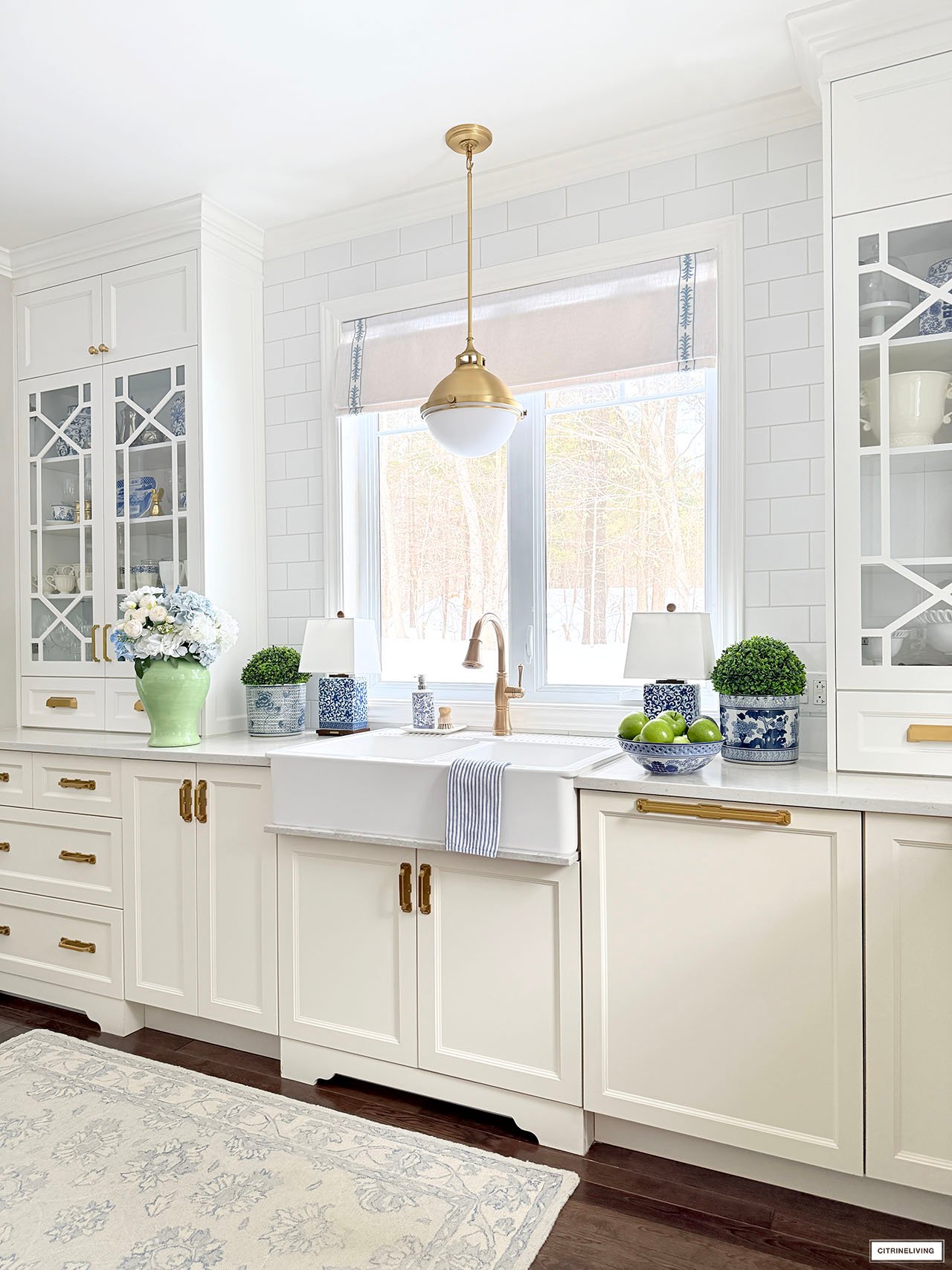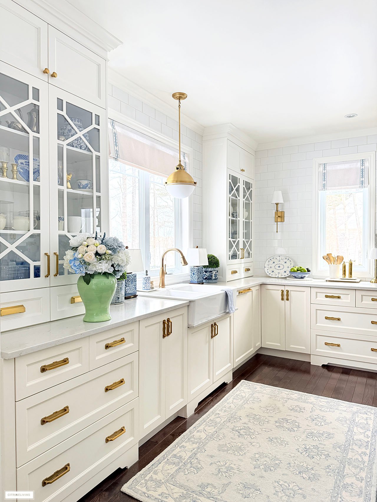 Rug | Roman shades (trim is R31) | Solid blue ginger jars | Green and white ginger jar | Solid green ginger jar | Small blue jar | Gold tray | Marble lazy susan | Scalloped tray | Scalloped plates | Gold rechargeable lamps | Faucet | Sink pendant light | Island pendant lights | Wall sconces | Bar stools | Striped fabric on stools | Blue and white platter | Brass salt mill | Brass pepper mill | Brass rail on hood | Pot filler | Monogrammed tea towel | Green block print napkins | Oil dispensers | Breville espresso maker | Tea kettle | Blue and white lamps | Blue and white planter | Blue and white planter | Small peony bundles | White hydrangeas | Light blue hydrangeas