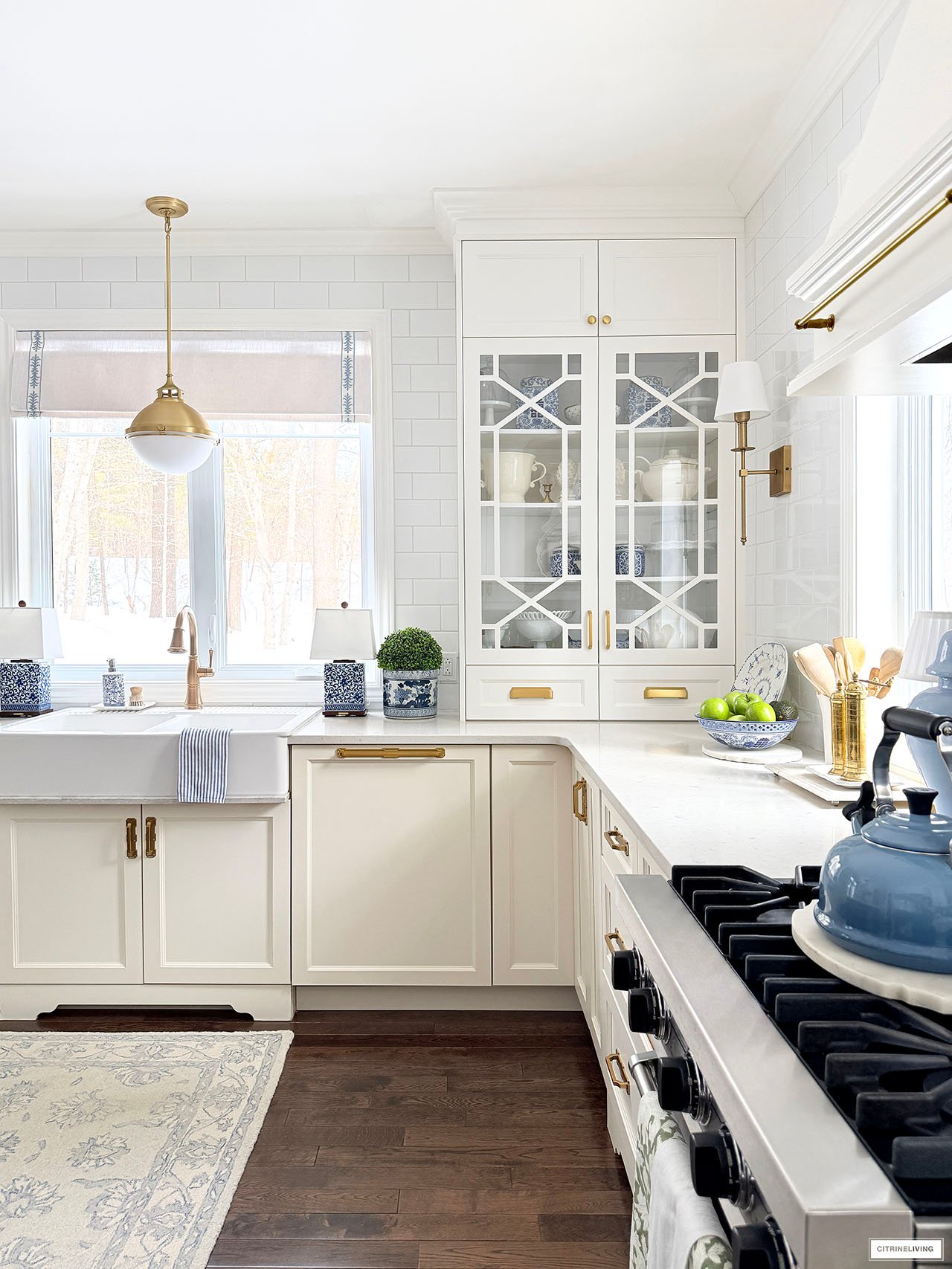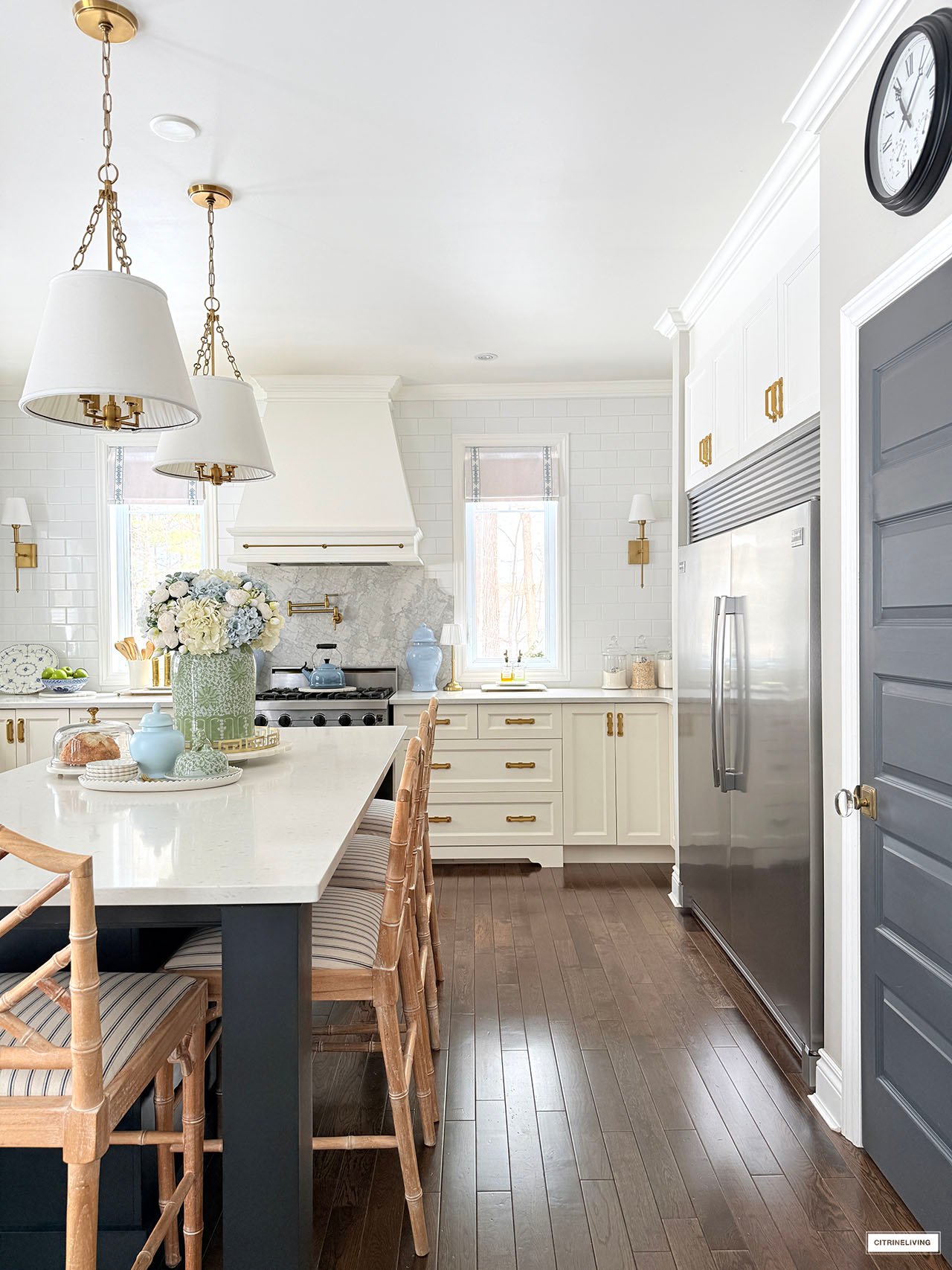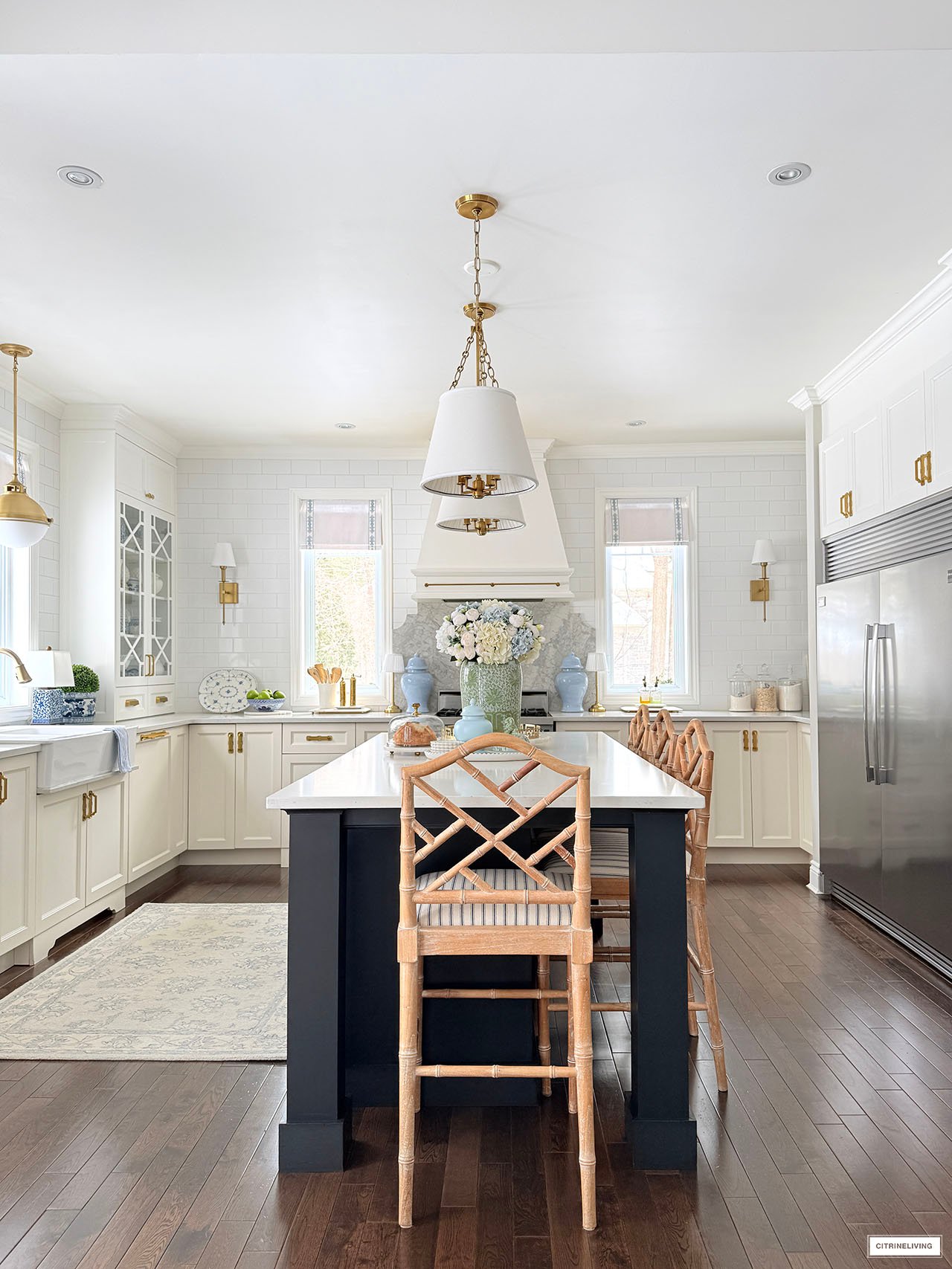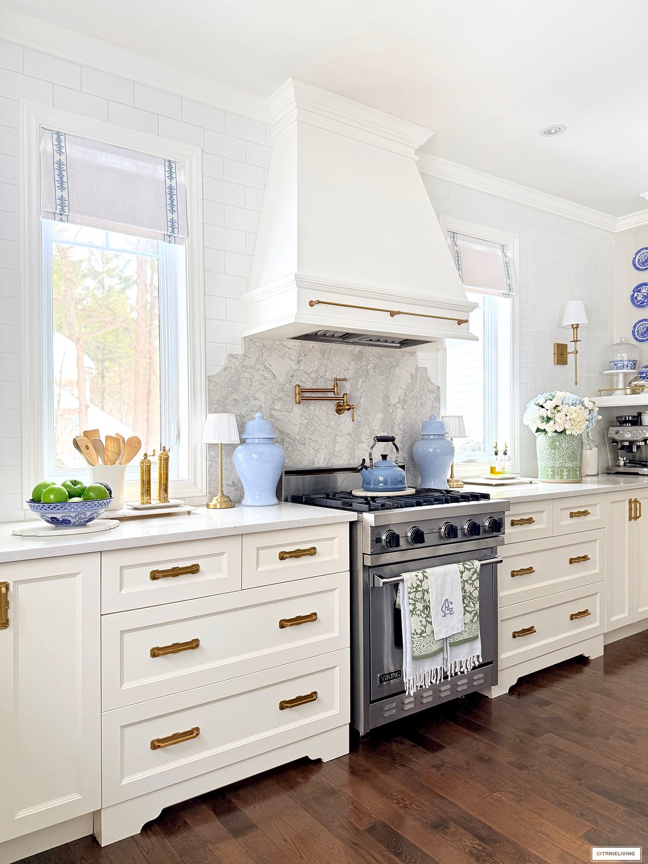 Rug | Roman shades (trim is R31) | Solid blue ginger jars | Green and white ginger jar | Solid green ginger jar | Small blue jar | Gold tray | Marble lazy susan | Scalloped tray | Scalloped plates | Gold rechargeable lamps | Faucet | Sink pendant light | Island pendant lights | Wall sconces | Bar stools | Striped fabric on stools | Blue and white platter | Brass salt mill | Brass pepper mill | Brass rail on hood | Pot filler | Monogrammed tea towel | Green block print napkins | Oil dispensers | Breville espresso maker | Tea kettle | Blue and white lamps | Blue and white planter | Blue and white planter | Small peony bundles | White hydrangeas | Light blue hydrangeas