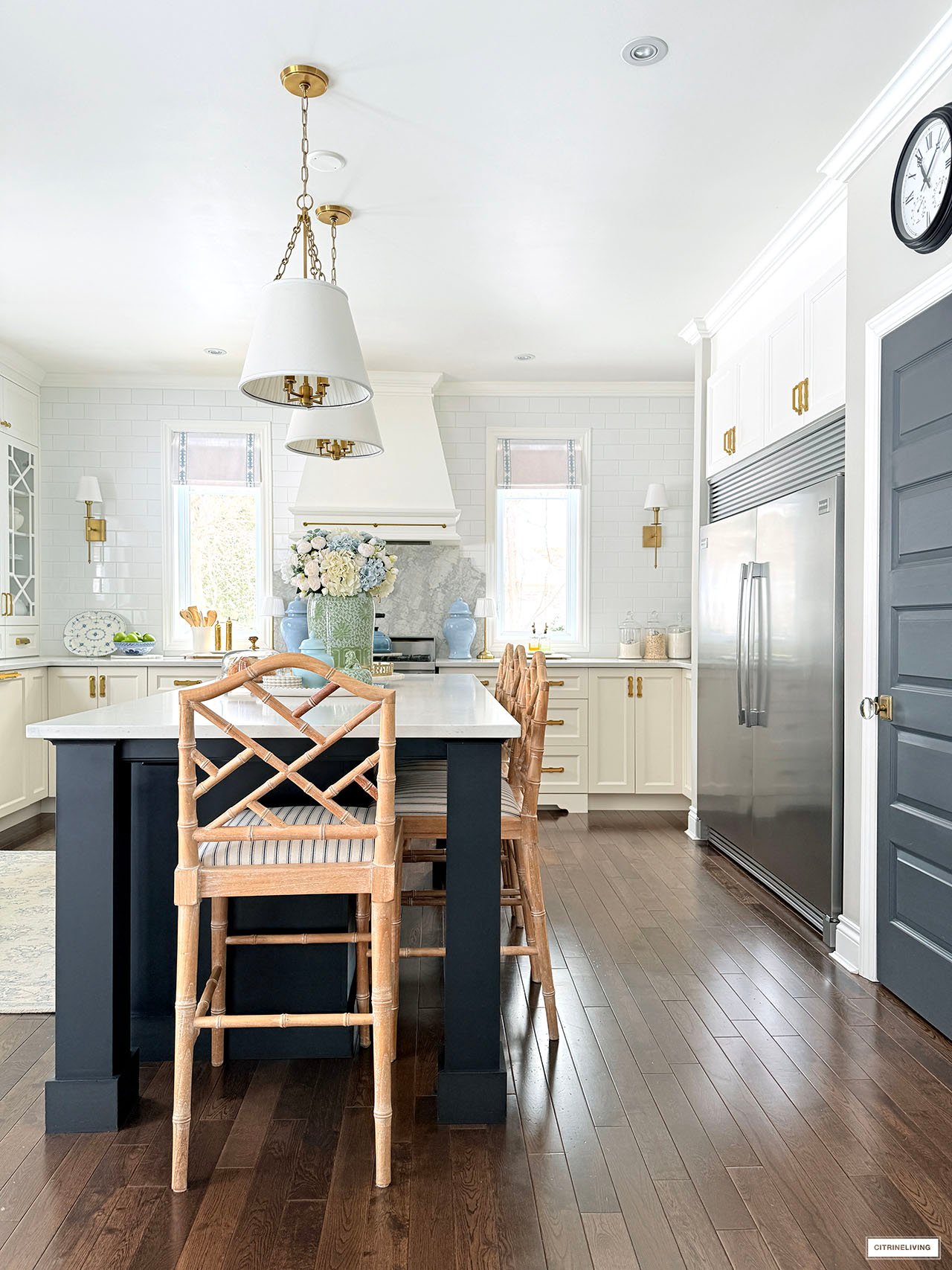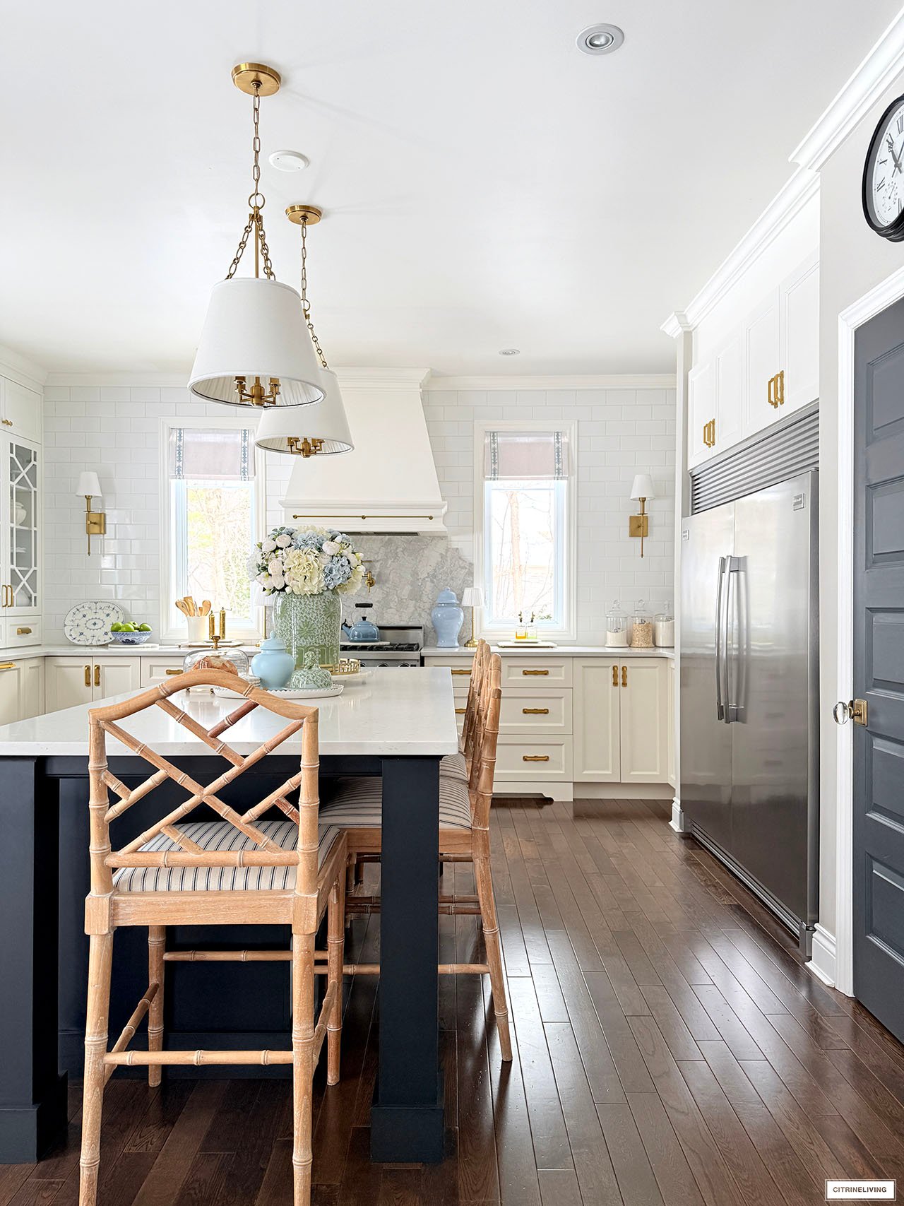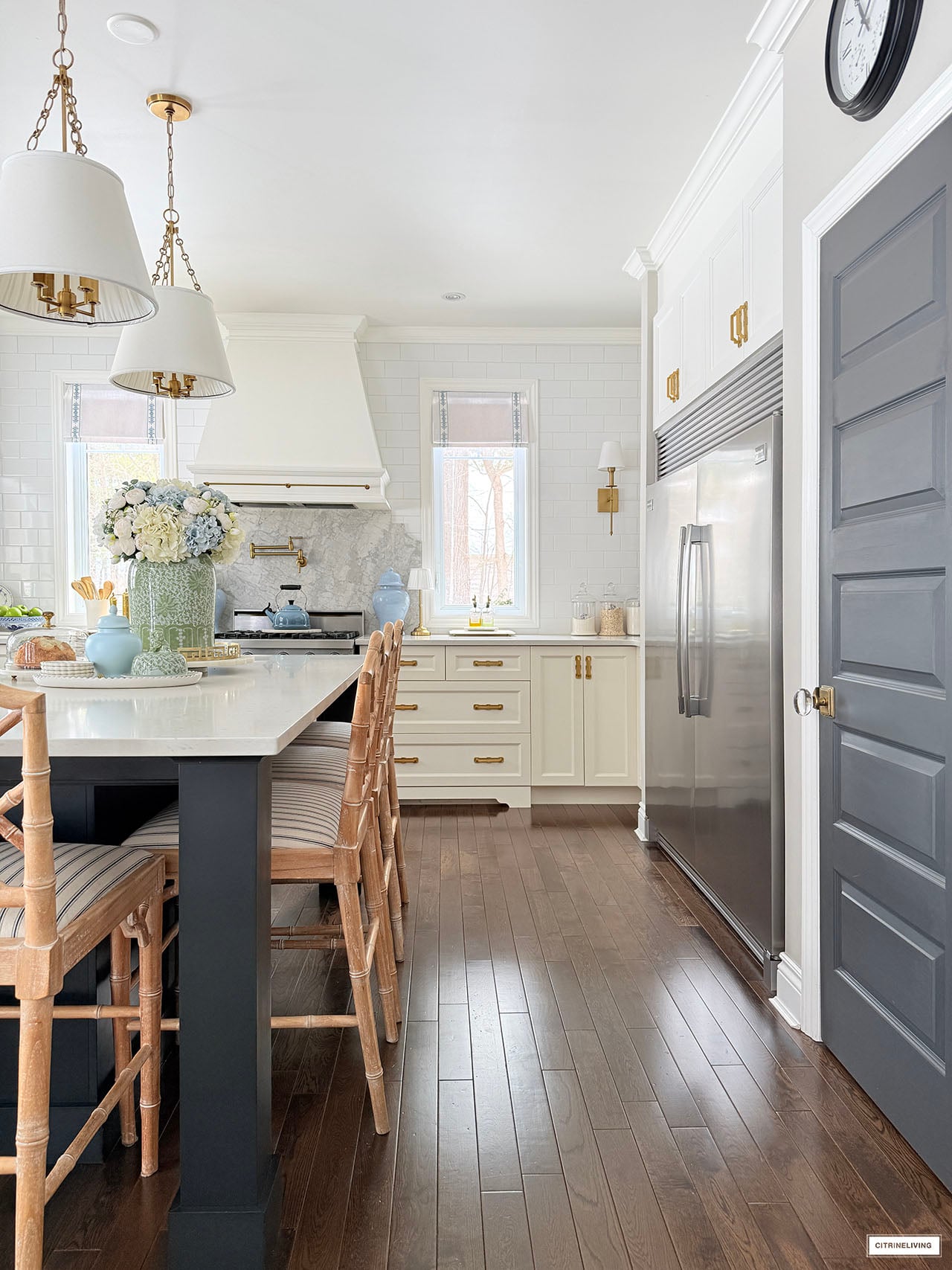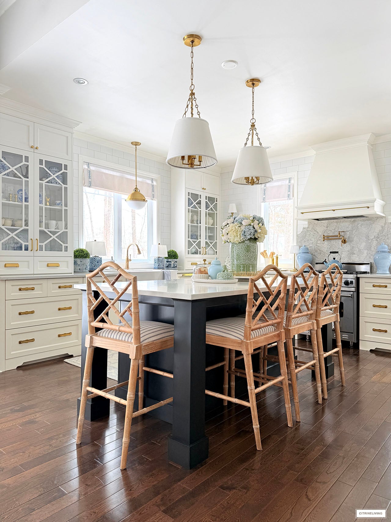 Rug | Roman shades (trim is R31) | Solid blue ginger jars | Green and white ginger jar | Solid green ginger jar | Small blue jar | Gold tray | Marble lazy susan | Scalloped tray | Scalloped plates | Gold rechargeable lamps | Faucet | Sink pendant light | Island pendant lights | Wall sconces | Bar stools | Striped fabric on stools | Blue and white platter | Brass salt mill | Brass pepper mill | Brass rail on hood | Pot filler | Monogrammed tea towel | Green block print napkins | Oil dispensers | Breville espresso maker | Tea kettle | Blue and white lamps | Blue and white planter | Blue and white planter | Small peony bundles | White hydrangeas | Light blue hydrangeas